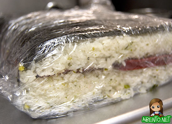 The whole thing crashed onto my cutting board and the top rice layer and spam slid off the bottom. I was pretty mad. I’d have eaten a cupcake, only I had none. I got the bottom book cover down, then slowly transferred the rice and spam over in pieces. One last piece of nori went on to act as the spine, then I wrapped the whole thing tightly up in saran wrap to get it in a good shape.