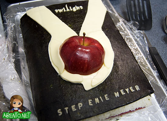My apologies for being absent the last couple of days, but after the stress of Isabella’s nori eye, I needed to take a bottle of chill pills and start the mental preparation for my entry in UH’s First Annual Edible Book Contest. When I first heard about the contest, I started wracking my brain thinking about what book I should do. Titles such as Hunger Games, The Lorax, Harry Potter, and Twilight came to mind immediately. In the end though, I picked Twilight, since I’d been meaning to do some Twilight bentos anyway with the release of the Eclipse trailer.