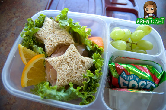 In this last lunch, I decided to go a little fancier to see how a pretty bento fared in the box. I made star sammies with lettuce border and orange slices for garnish. In the side containers, I put grapes, a fruit by the foot, an a lychee jelly. These are Baby Girl’s favorite things, but unfortunately she’s in a “meat phase” right now and the bread and lettuce all came back. I asked her what she ate first and she said the lychee jelly.