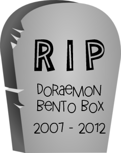 As I mentioned, last week Buddy killed another bento box. I had this one since my first year bento blogging, so here’s a little memorial for it. I’ve stopped since stopped giving him bento boxes with handles.